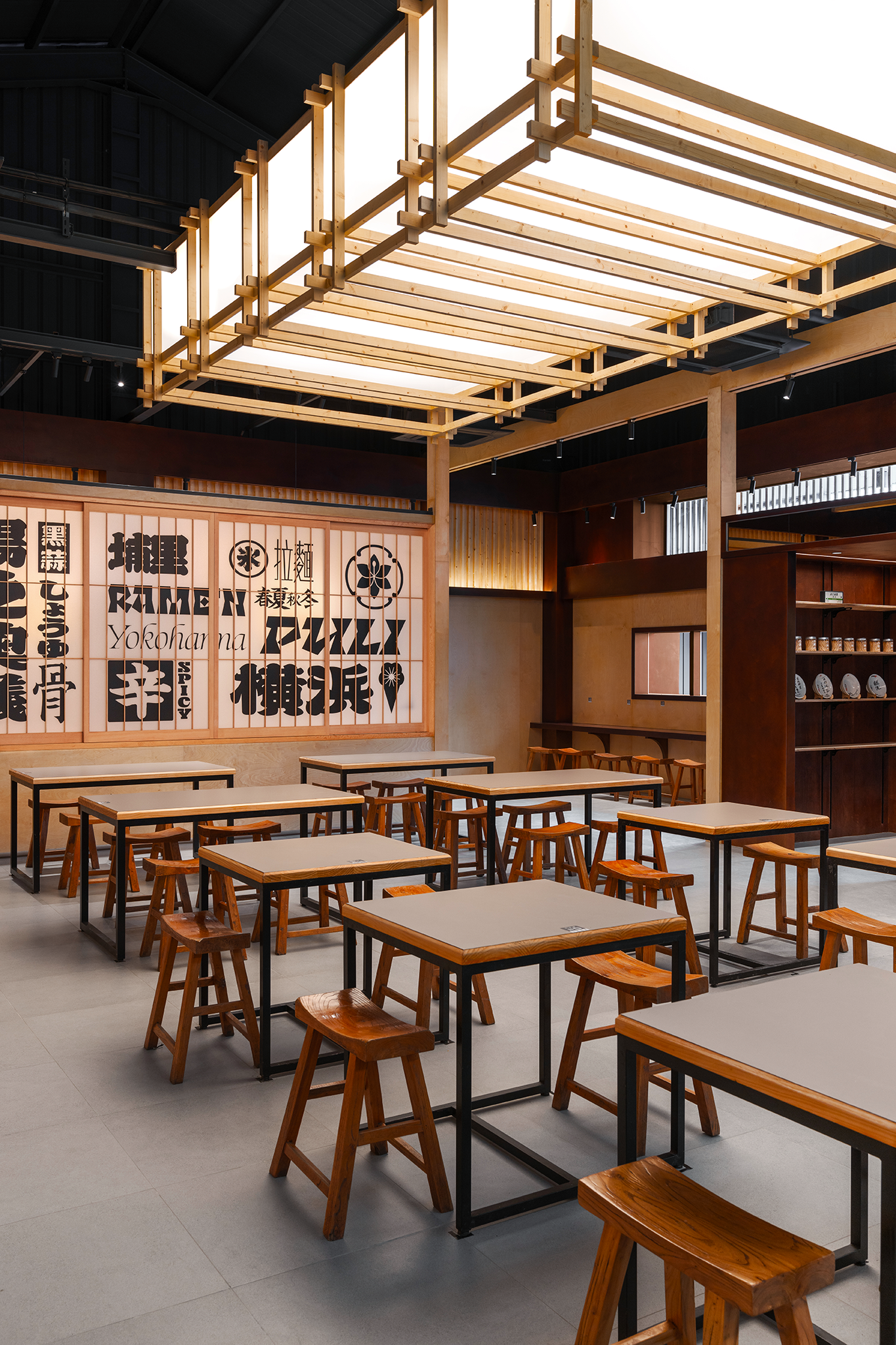 承襲自日本橫浜的口味與訓練,位於南投埔里的橫浜拉麵自開幕後十數年來一直廣受當地歡迎,成為融合台灣與日本的代表性拉麵品牌。2024年,由於品牌進入擴店與升級的階段,因此委託我們設計視覺識別與品牌塑造。因應橫濱拉麵的品牌塑造方向,主體文字「橫濱」 參考了大量江戶時代常用的燈籠文字,並同時融合台灣常用厚實的楷體字,字體飽滿有力,略帶手寫的筆觸營造出當代的書法字體感受,而右方的小紅色印章標示「拉麵」,以紅色方形印章形式呈現,增添一絲復古感,同時提供了視覺上的對比,使整體設計更具色彩明度。正因橫浜拉麵的品牌定位不以嚴肅、古法著稱,而是融合台灣味道的自創口味,因此我們在地域感上刻意跳脫特定國家的風格,以當代而俐落的黑白色與大量描繪當地埔里人文特色的插畫,逐步構築出這個跳脫傳統拉麵的品牌形象。
